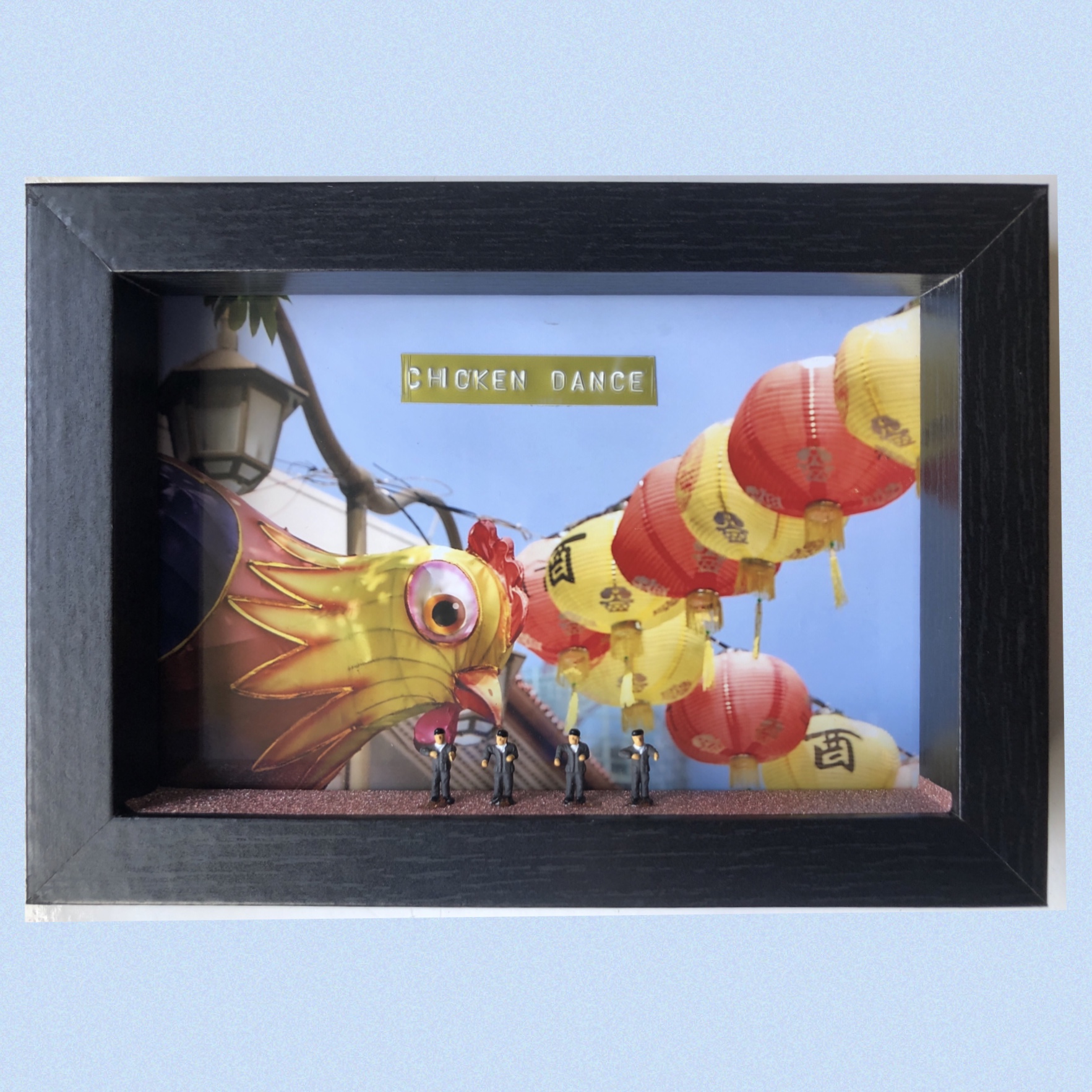 Achtergrondfoto Chinatown, Singapore. De figuurtjes doen hun dansje, hebben hun moment of fame met de voetjes van de glittervloer, chicken dance oftewel de vogeltjesdans