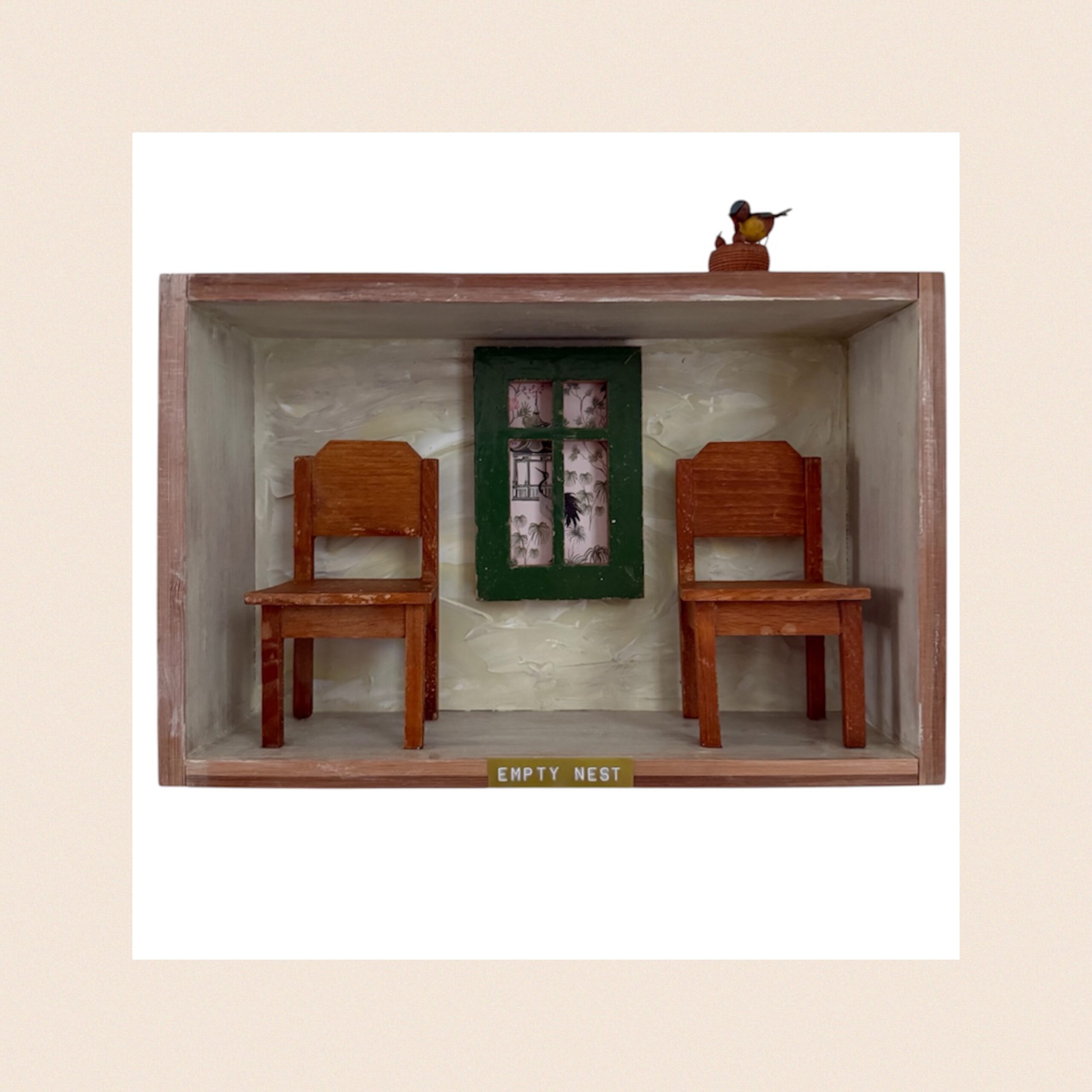 kastje met 2 lege stoelen naast het raam, een empty nest, op het “dak” een vogelnestje met jongen