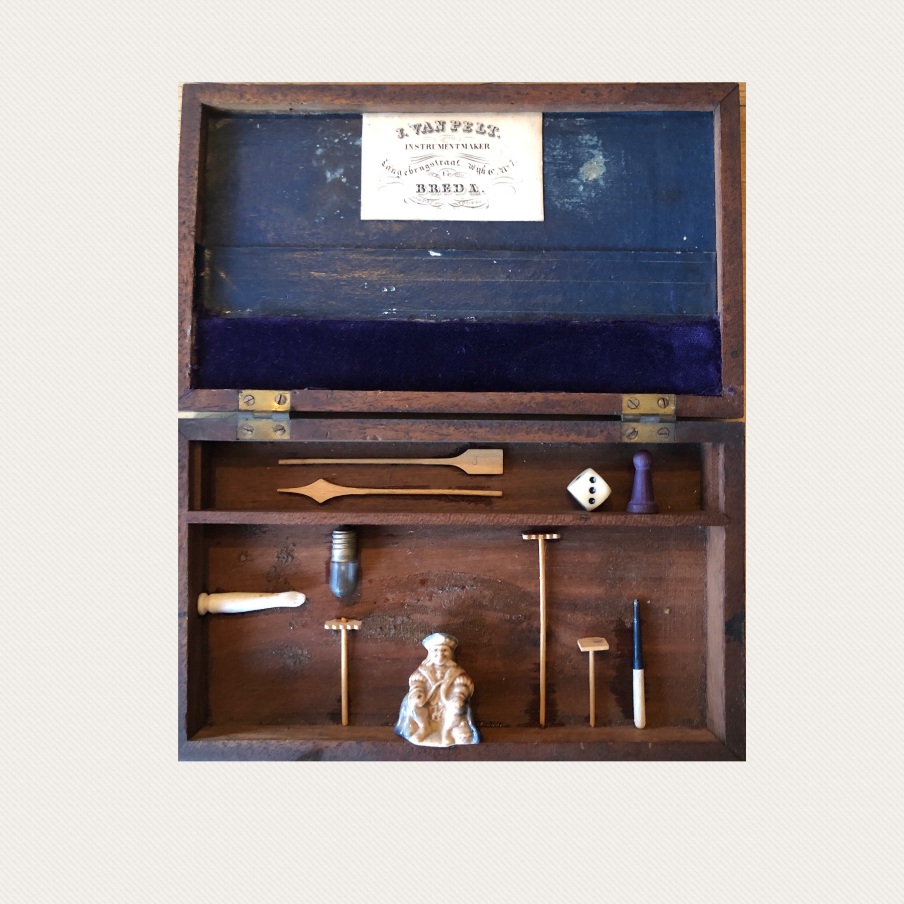 In een kistje van een instrumentmaker (eind 19e eeuw) een verzameling van gereedschap, de maker en zijn hand