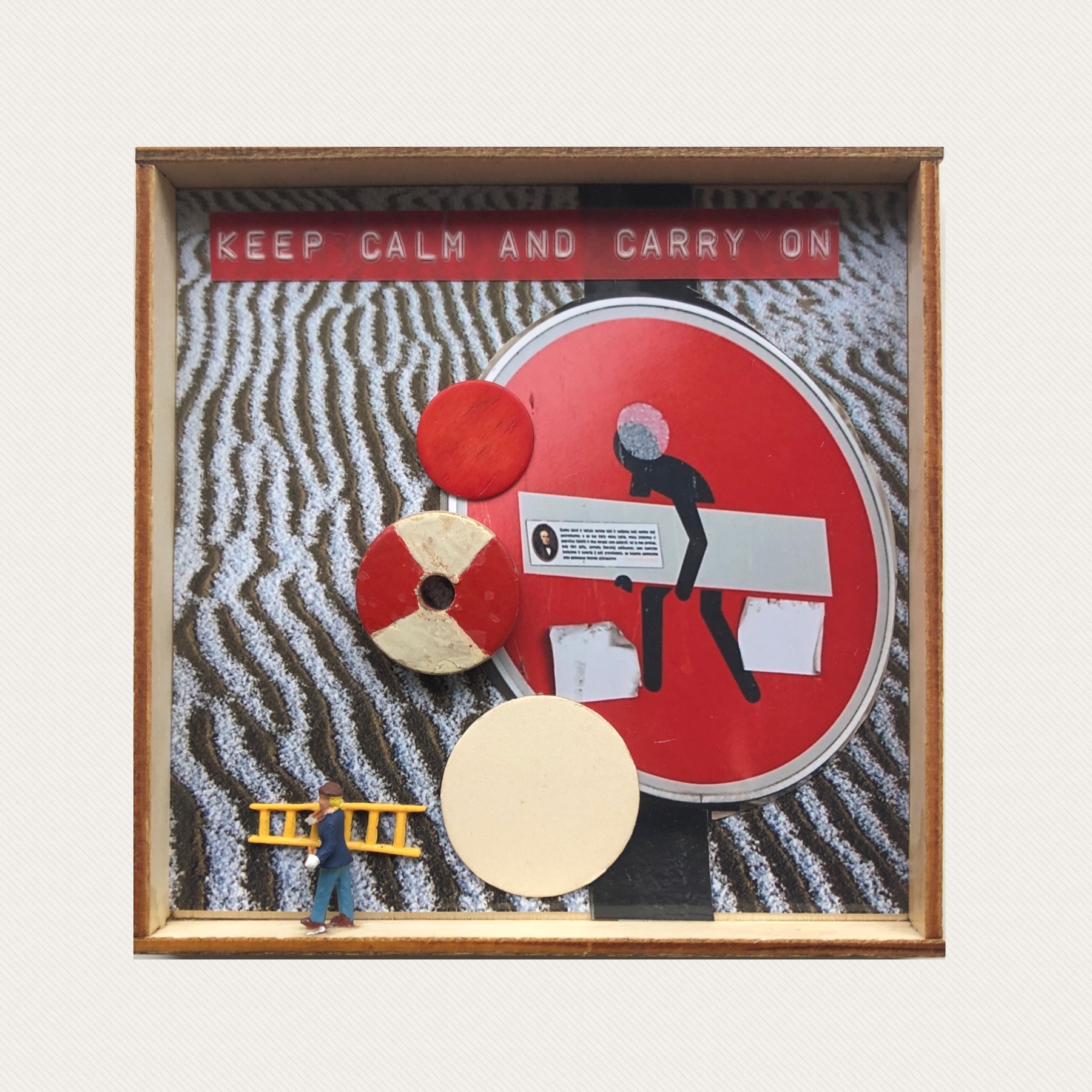 Klein lijstje met achtergrond foto van besneeuw strand met daarop foto van verkeersbord in Parijs, figuurtje ervoor sjouwt met ladder. Wat er ook gebeurt: keep calm and carry on