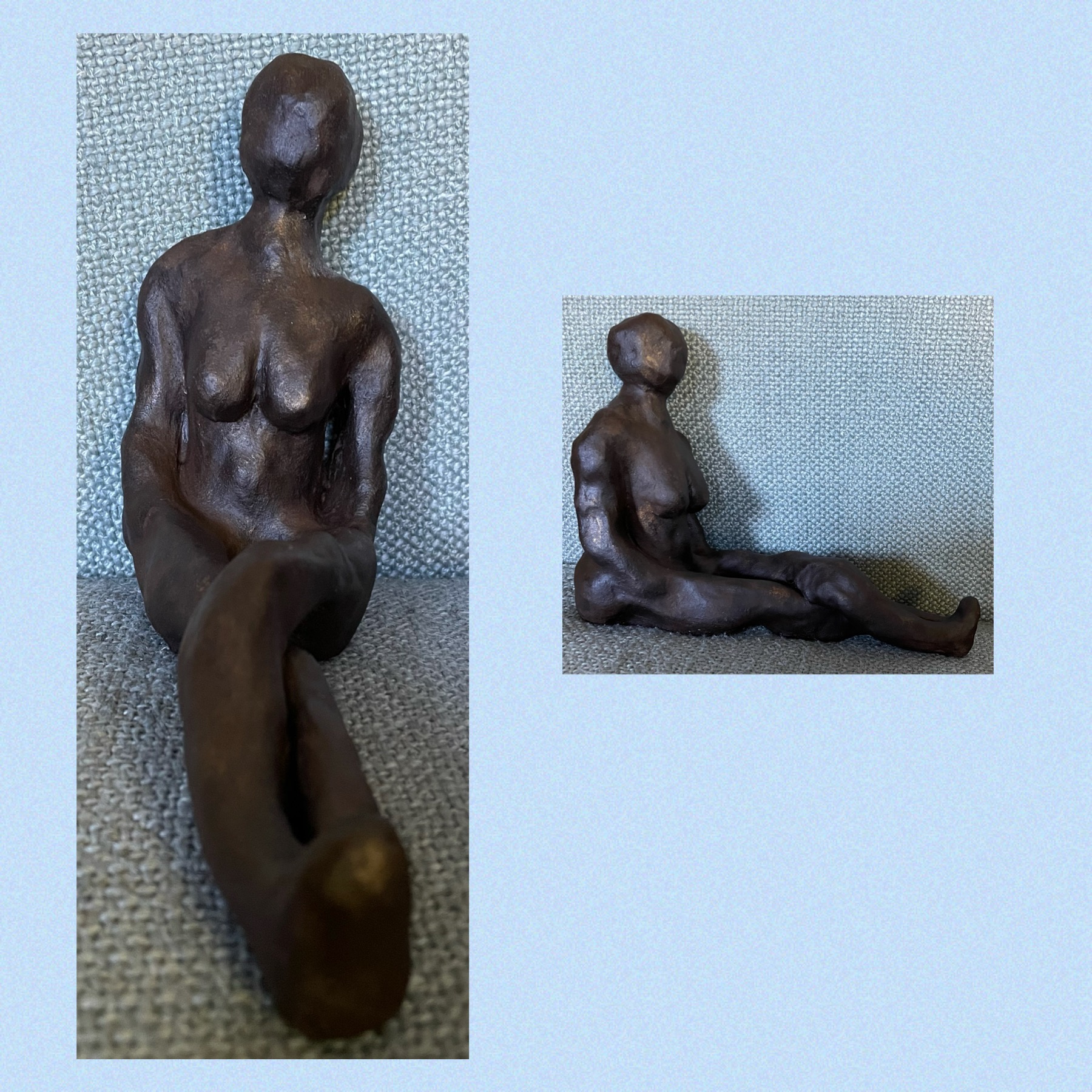 Beeld van klei, beschilderd van vrouw figuur die met haar lange benen voor zich uit over elkaar zit