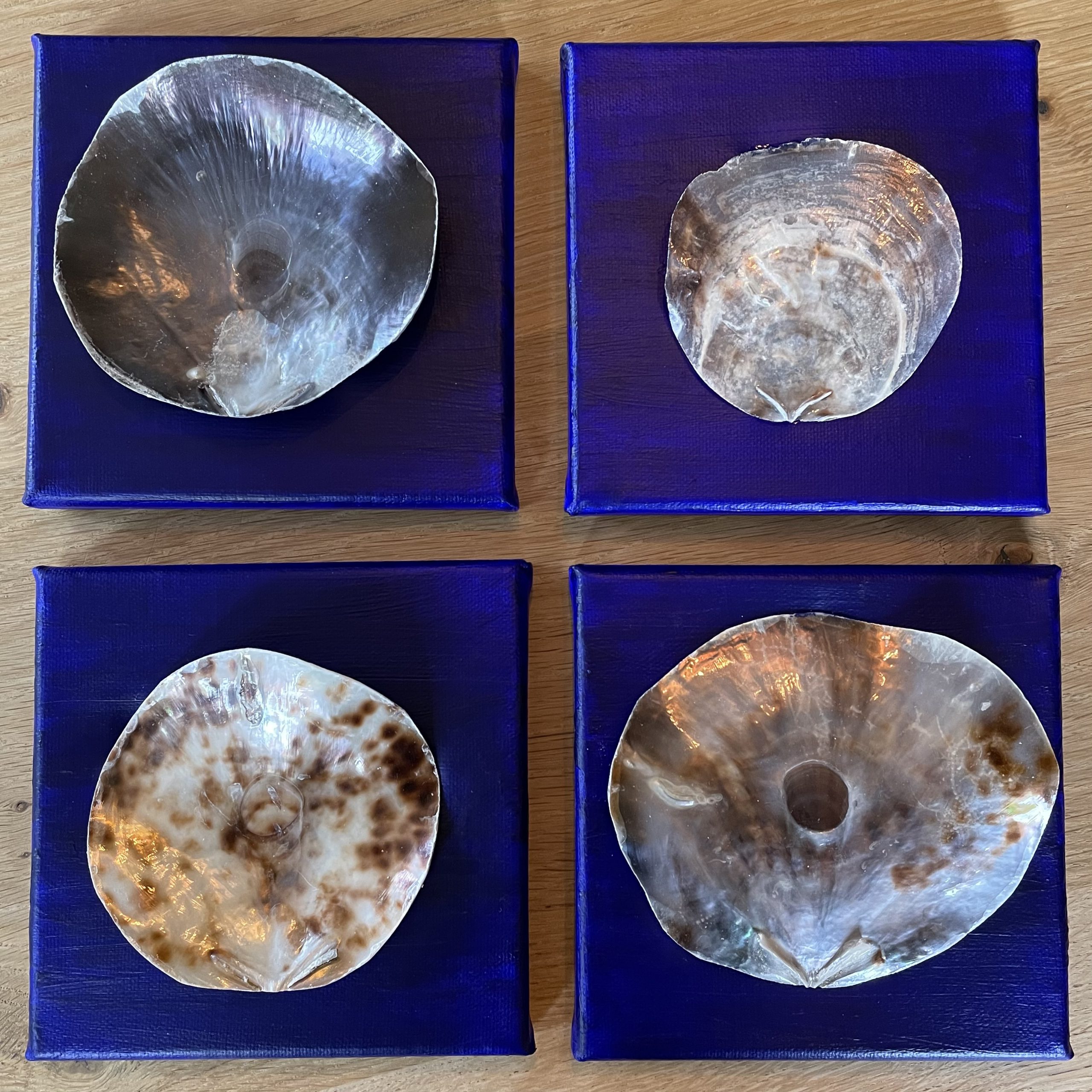 Vier canvas doekjes met ieder een zadeloester tegen achtergrond van ultramarijn blauw