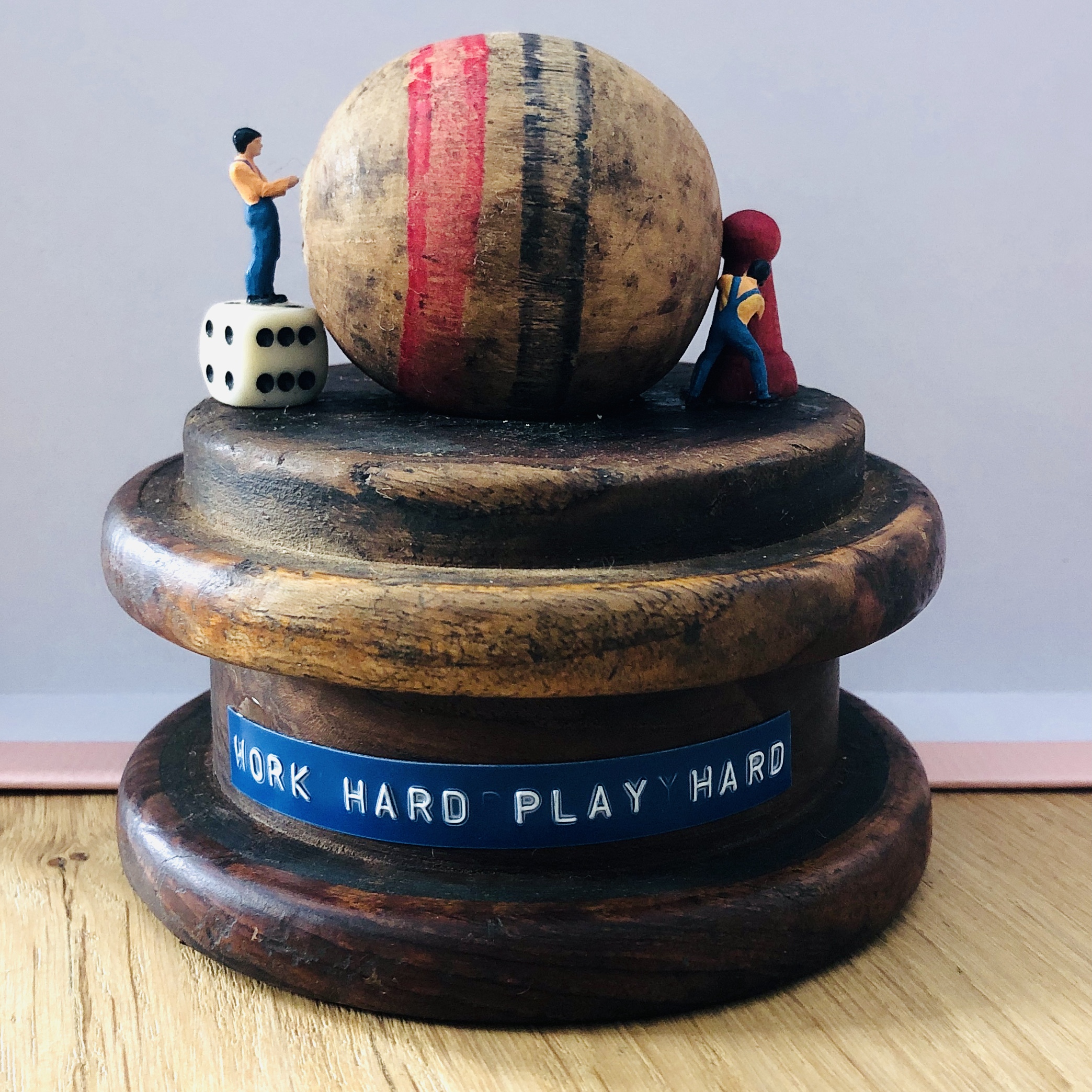 Werkmannen zijn aan het werk met de installatie, de dobbelsteen, pion en bal staan voor het spel. Word hard play hard, doe wat je leuk vindt of vindt in ieder geval de balans tussen hard werken en plezier